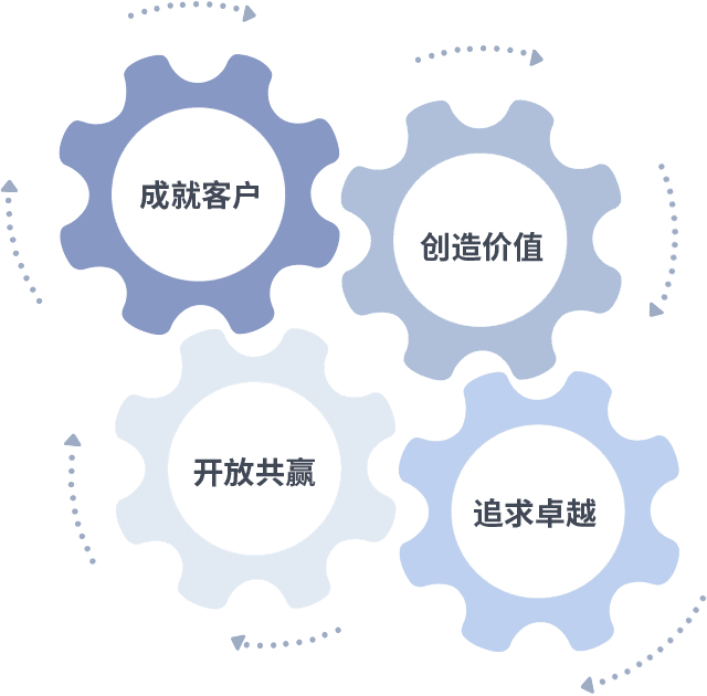 成就客户是一切决策的出发点,,创造价值是衡量所有工作的标准,,追求卓越是我们做事做人的态度,,,开放共赢是我们的格局也是最终的结果。。。价值观的齿轮环环相扣,,,,推动着组织里的每个人不断向前。。